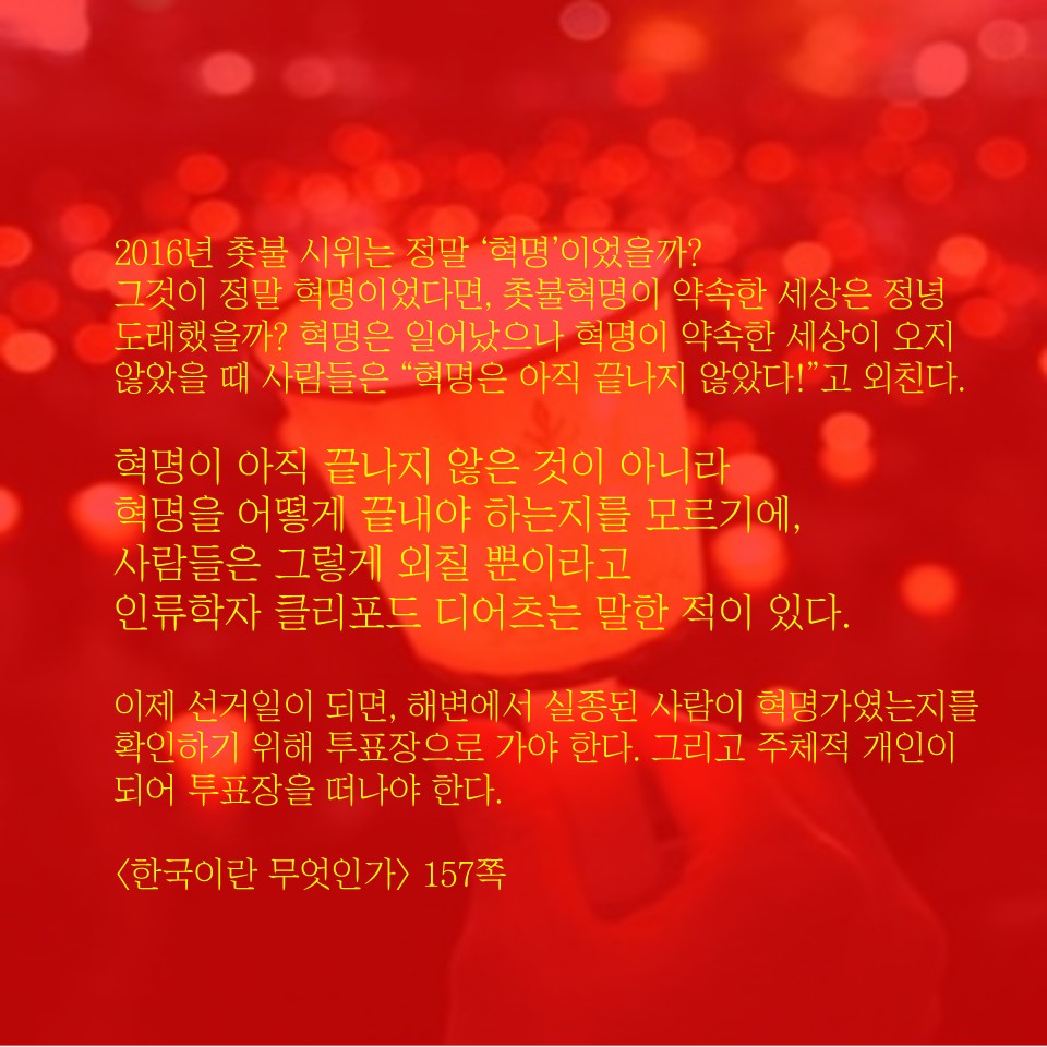 혁명은 혁명이 끝난 후가 훨씬 더 의미있는 순간입니다. 그래서 끝나지 않은 것입니다. 그때부터 시작입니다.